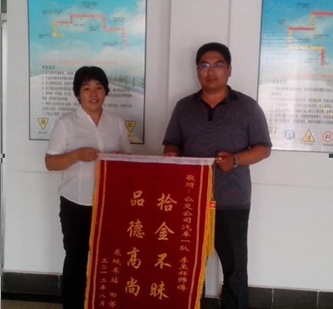 2012年8月2,長途總站東城車站職工田芳女士拿著一面寫有“拾金不昧、品德高尚”的錦旗來到市公交公司汽車一隊(duì),感謝車隊(duì)李玉祥師傅拾金不昧的高尚品德。
