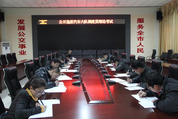 2013年12月底,市公交公司汽車六隊3名調(diào)度員公開選拔理論考試在公司一樓會議室開考,符合申報條件的15名員工,在規(guī)定時間內(nèi)按照給定的5個題目,圍繞調(diào)度職責、如何做好運營調(diào)度工作等相關(guān)內(nèi)容進行了認真答卷。本著公開、公正的原則,由公司領(lǐng)導(dǎo)班子、人事科長、所在車隊負責人組成的評委對密封試卷現(xiàn)場評分后,對理論成績排名前6名的同志當場進行了民主評議。最后,張東衛(wèi)、張光輝、潘志紅3名同志理論成績、民主評議綜合得分排名居前三位。經(jīng)過3天公示無異議后,3名同志已于2014年1月3日到崗培訓(xùn)。