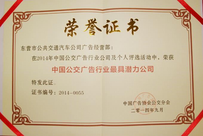 近日,在中國廣告協(xié)會公交分會舉行的《中國公交廣告行業(yè)最具影響力公司》和《中國公交廣告行業(yè)最具潛力公司》評選活動中,東營市公交公司廣告部喜獲“中國公交廣告行業(yè)最具潛力公司”稱號,這表明在公司領導的大力支持和全體職工的共同努力下,經廣告行業(yè)協(xié)會的規(guī)范引領,廣告部的各方面工作已經取得了穩(wěn)步的發(fā)展,具備了一定競爭實力,這一稱號,將進一步激發(fā)全體廣告職工的工作熱情,以整體強勁的勢頭,投身到激烈的行業(yè)競爭當中,再創(chuàng)更好的經濟效益和社會效益。