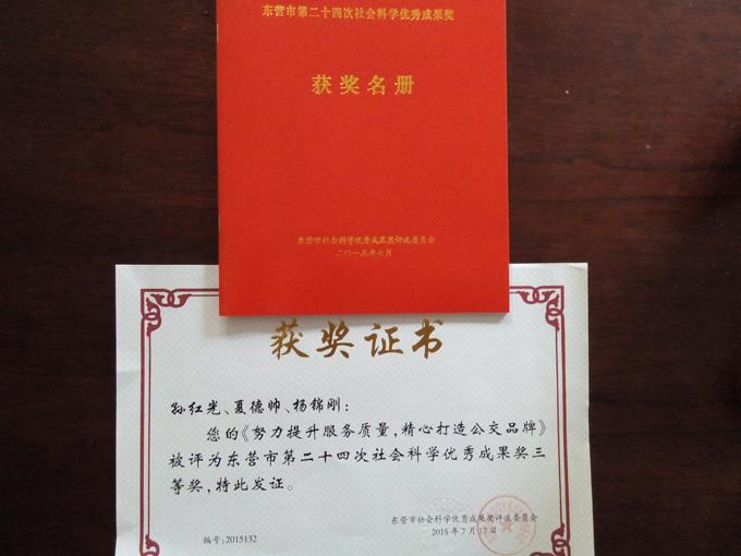 近日,東營(yíng)市第二十四次社會(huì)科學(xué)優(yōu)秀成果獎(jiǎng)評(píng)選結(jié)果揭曉,由市公交公司組織申報(bào)的《努力提升服務(wù)質(zhì)量,精心打造公交品牌》論文喜獲東營(yíng)市第二十四次社會(huì)科學(xué)優(yōu)秀成果獎(jiǎng)三等獎(jiǎng)。
