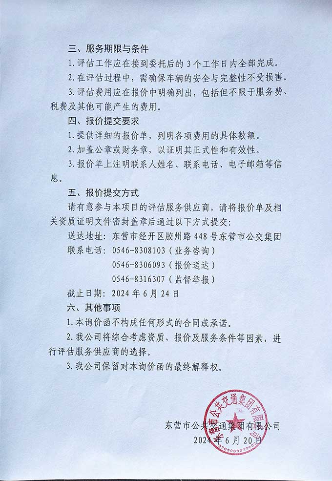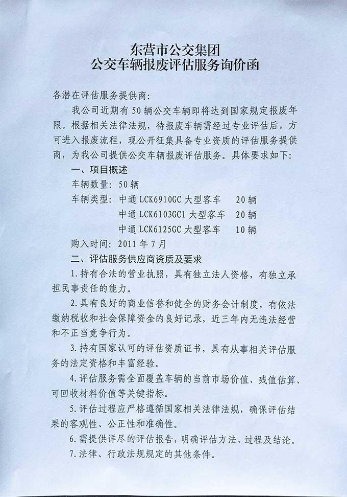我公司近期有50輛公交車輛即將達(dá)到國家規(guī)定報廢年限。根據(jù)相關(guān)法律法規(guī),待報廢車輛需經(jīng)過專業(yè)評估后,方可進(jìn)入報廢流程,現(xiàn)公開征集具備專業(yè)資質(zhì)的評估服務(wù)提供商,為我公司提供公交車輛報廢評估服務(wù)。具體要求如下: