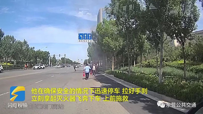 近日,東營38路公交車駕駛員李斌行駛至菏澤路與西三路路口西100米附近看到前方濃煙滾滾,他在確保安全的情況下迅速停車,拉好手剎,立刻拿起滅火器飛奔下車,上前施救。原來是一輛電動(dòng)三輪車突然自燃冒煙,同時(shí)車上還攜帶大量電動(dòng)單車,為了防止火勢迅速蔓延,他迅速撲救,火勢得到了控制。