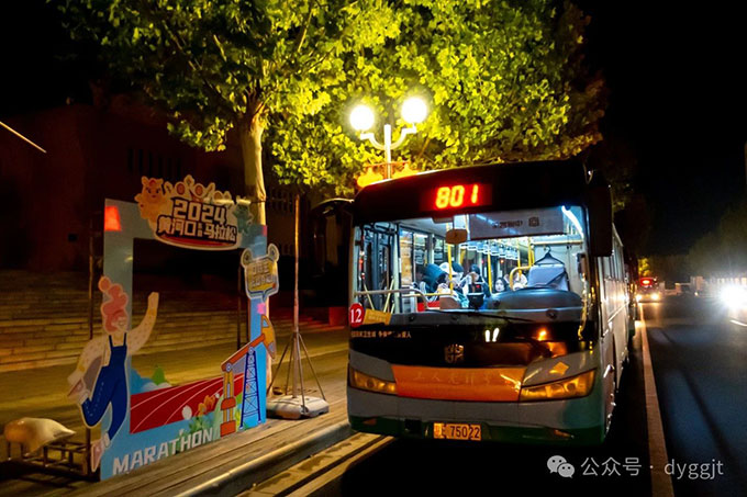 在賽事當天,市公交集團駕駛員凌晨三點半分別從汽車一隊、汽車二隊、汽車五隊、通勤車隊駐地到達了指定地點集結完畢。他們穿著整潔的制服,面帶微笑,熱情地迎接每一位志愿者登車。為了方便志愿者們識別,每輛公交車上都貼有明顯的“黃河口(東營)馬拉松賽事轉運車”標志。