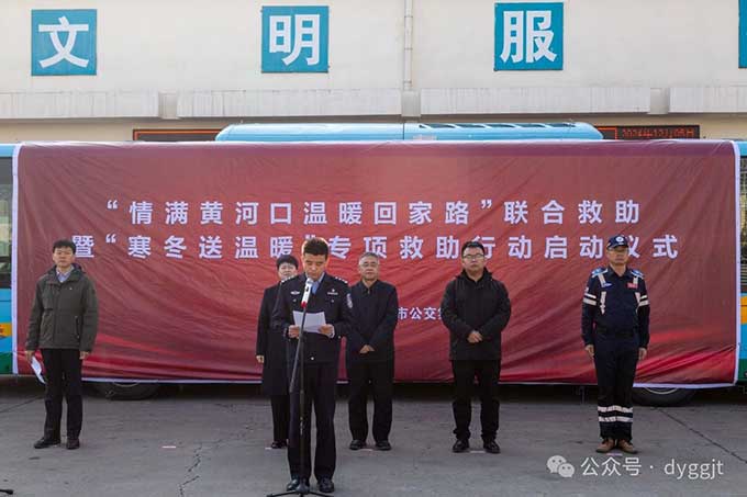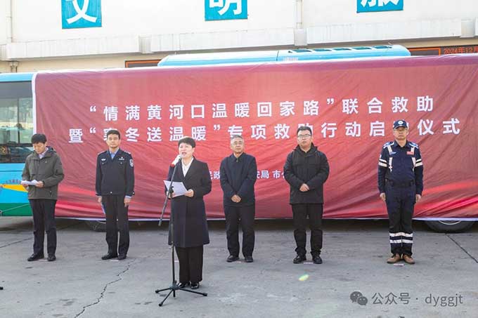 12月6日,市民政局聯(lián)合市公安局110指揮中心、市公交集團共同舉辦“情滿黃河口 溫暖回家路”聯(lián)合救助暨“寒冬送溫暖”專項救助行動啟動儀式。市民政局副局長王金娥,市公交集團黨委書記趙龍,市公安局110指揮中心副主任劉文濤,以及各縣區(qū)、開發(fā)區(qū)分管領導、流浪乞討工作負責同志,市社會救助服務中心全體工作人員和部分公交駕駛員等共100余人,參加了此次活動。