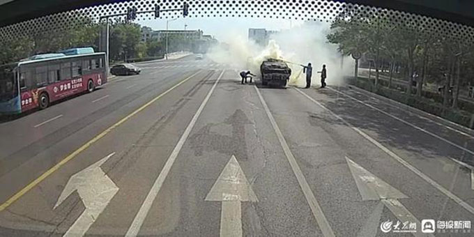 9月10日13點03分,東營公交通勤車隊駕駛員王維明像往常一樣執(zhí)行124路公交車運營任務,當他駕車行駛到沂州路與瀏陽河路交叉口紅綠燈時,發(fā)現(xiàn)了異常情況——前方一輛貨車起火了,王師傅沒有絲毫畏懼,立即停車開門,提起車載滅火器沖下了車。